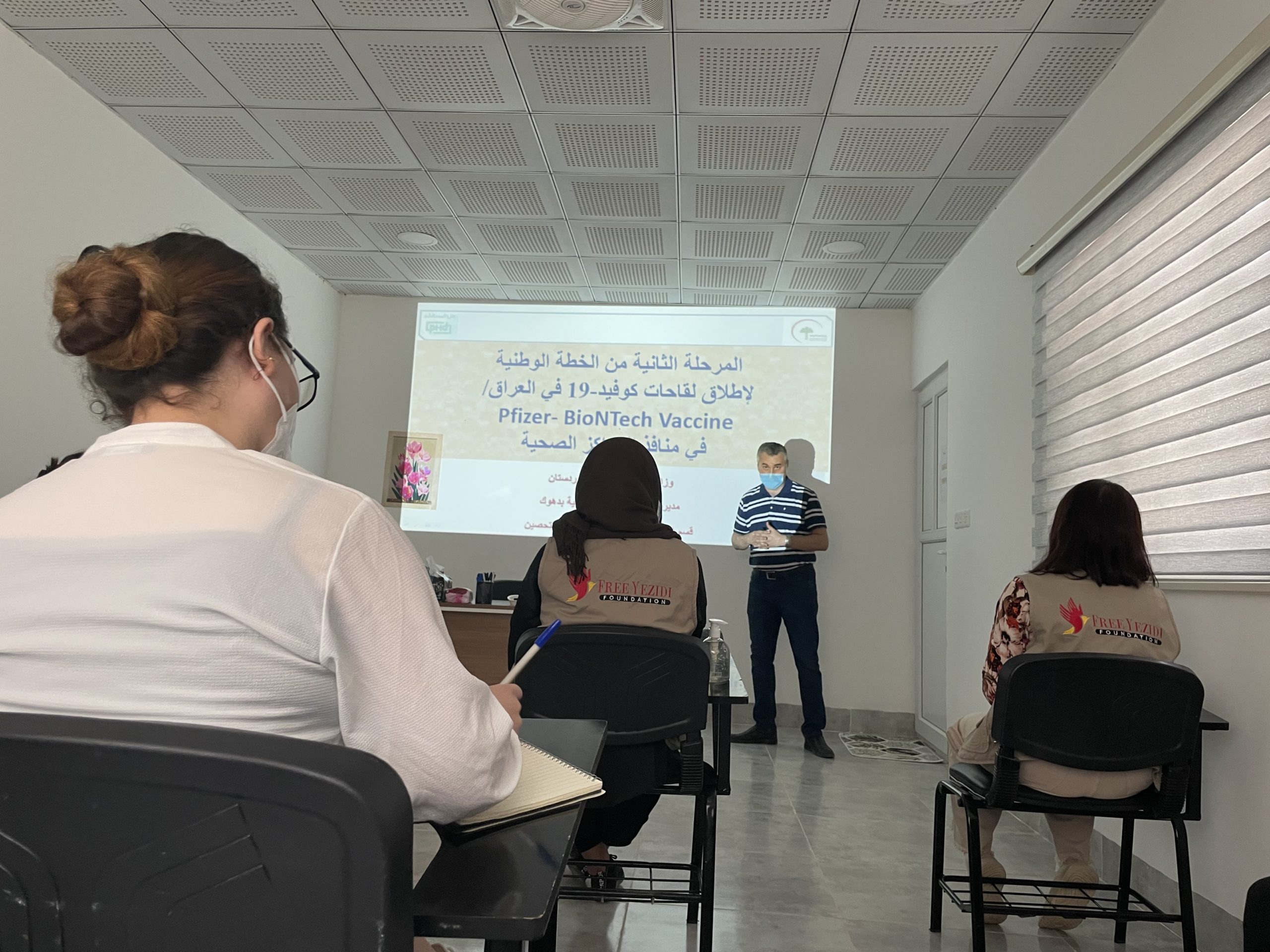 FYF staff members received training this week from Duhok’s Preventative Health Office about COVID-19 and the vaccines available to Iraqi citizens. It is essential that Yezidi civil society do its best to provide the community with accurate information about the pandemic and the vaccines. In IDP camps especially, there is a great risk of the virus spreading among families living in close quarters. FYF will be hosting vaccine information sessions at the FYF Enterprise & Training Center to inform Yezidis about the vaccines and help them register.