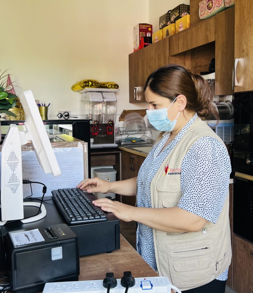 “As a resilient and determined Yezidi IDP woman who has been living in a rented house for the past eight years, I have found it very difficult to provide for my family and children. I currently work at the Sugar is Sweet Bakery and Cafe at FYF’s Enterprise and Training Center. My job helps me both financially and psychologically, as I feel safe and supported by everyone here. I am so happy that I also have the opportunity to attend educational courses at the center because I always wanted to learn reading and writing to be able to better support my children in the future and help them learn.”
