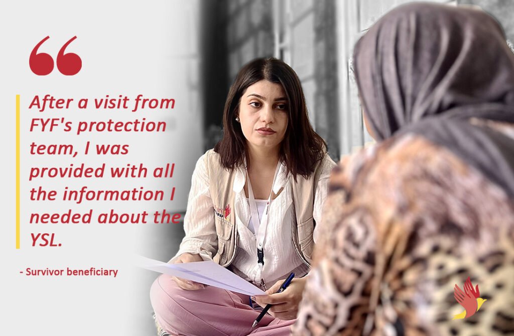 The survivor remarked on her ability to apply to the Yezidi Survivors Law (YSL) after support from FYF’s protection team: “After the passing of the YSL, I saw many survivors applying to receive reparations, but I didn’t know anything about the YSL, how to apply, what papers were required, and where to apply. After a visit from FYF’s protection team, I was provided with all the information I needed about the YSL.