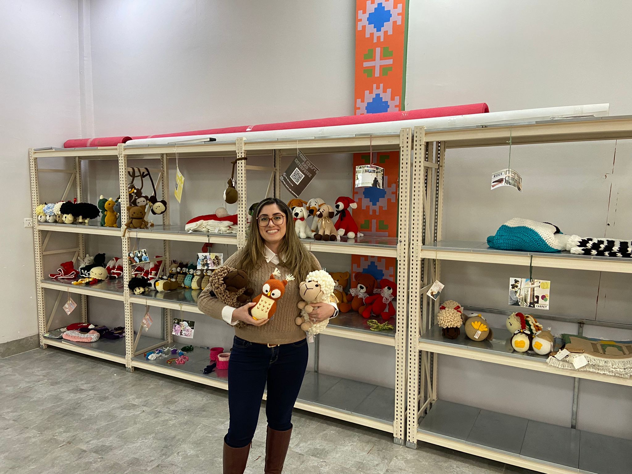 FYF’s Executive Director Pari Ibrahim visited the Enterprise & Training Center (ETC) to speak with the Yezidi women artisans and review the products they have crafted. The quality and variety of Chonky Animals were very impressive, as well as the carpets, rugs, and blankets.