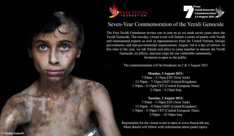 The Free Yezidi Foundation (FYF) will hold a series of virtual panels on 2-3 August 2021 to mark seven years since the Yezidi Genocide perpetrated by ISIS (Daesh). The virtual panels will include Yezidi and international experts as well as representatives from the United Nations, foreign governments, and non-governmental organizations.