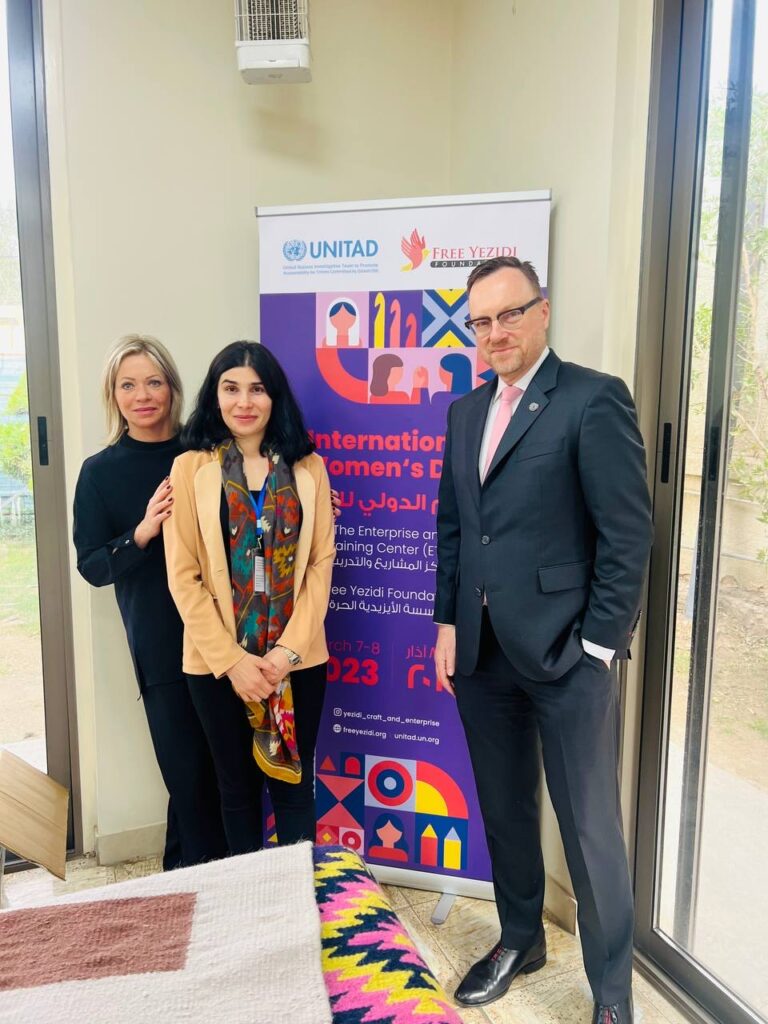 UNITAD arranged for FYF Country Director, Hewan Omer, and her team to bring more than 100 hand-crafted artisanal items to Baghdad. UN Mission in Iraq chief, Jeanine Hennis Plasschaert, joined head of UNITAD, Christian Ritscher, as they opened the event. From 7-8 March, UN staff members purchased more than $5,000 in crafted items, including stuffed animals and woven carpets and rugs. At the Enterprise & Training Center, the Yezidi artisans collect all proceeds from the items they create, aside from operational costs necessary to maintain the facility.